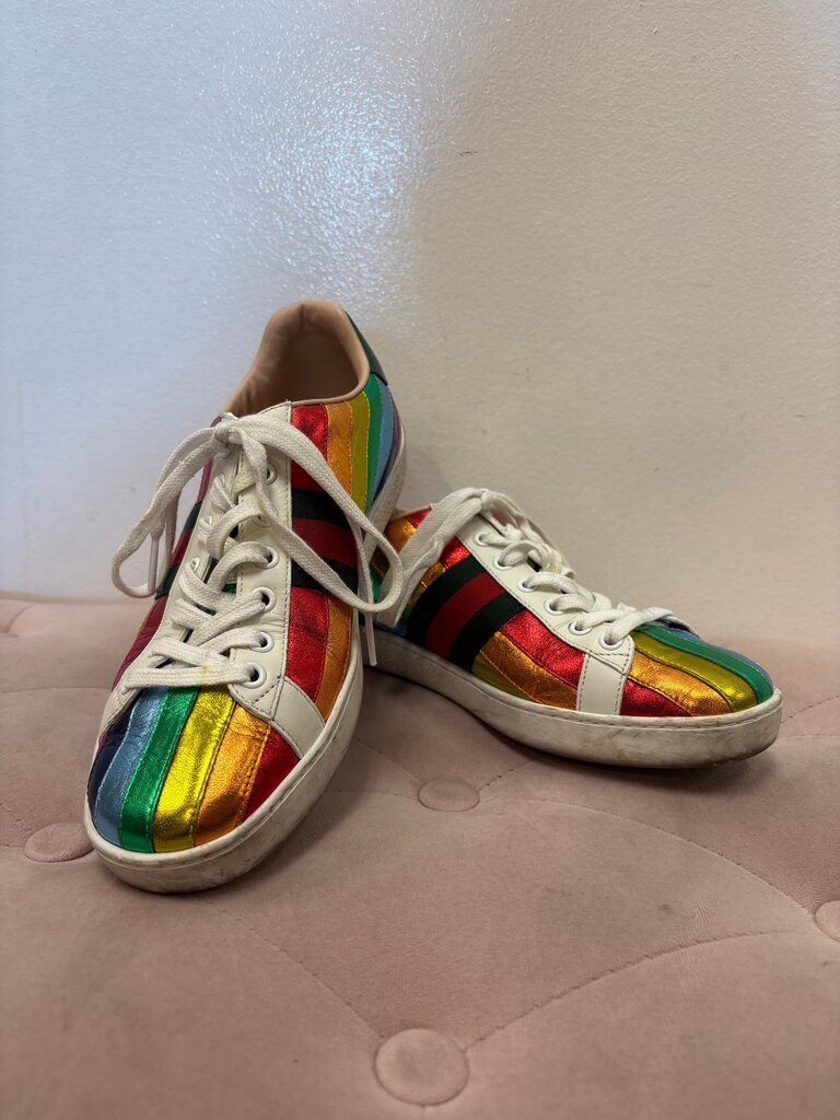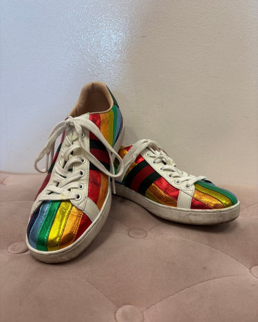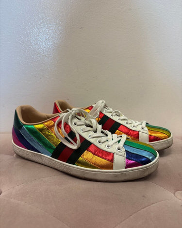 Stylish and vibrant Gucci sneakers featuring a rainbow metallic design, perfect for adding a pop of color to any outfit.