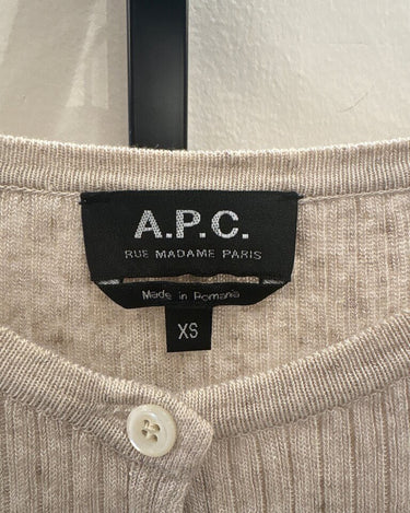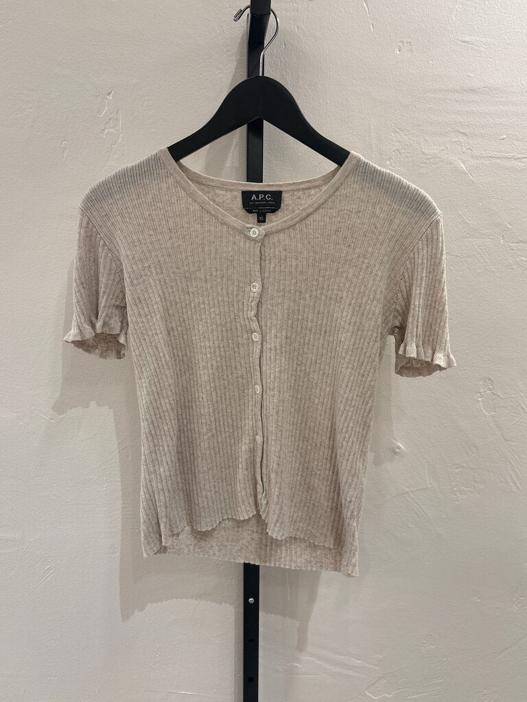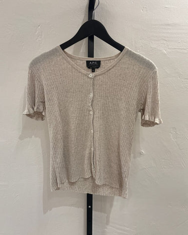 A stylish beige ribbed short sleeve top by A.P.C. featuring a button-down design, perfect for casual wear.