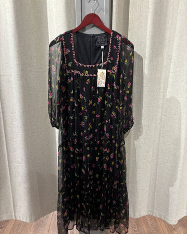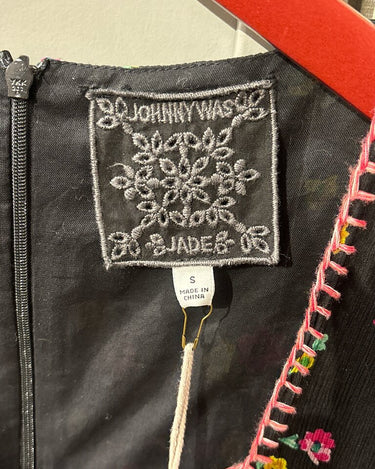 Elegant black dress by Johnny Was featuring floral patterns and a stylish design, perfect for casual outings or special occasions.