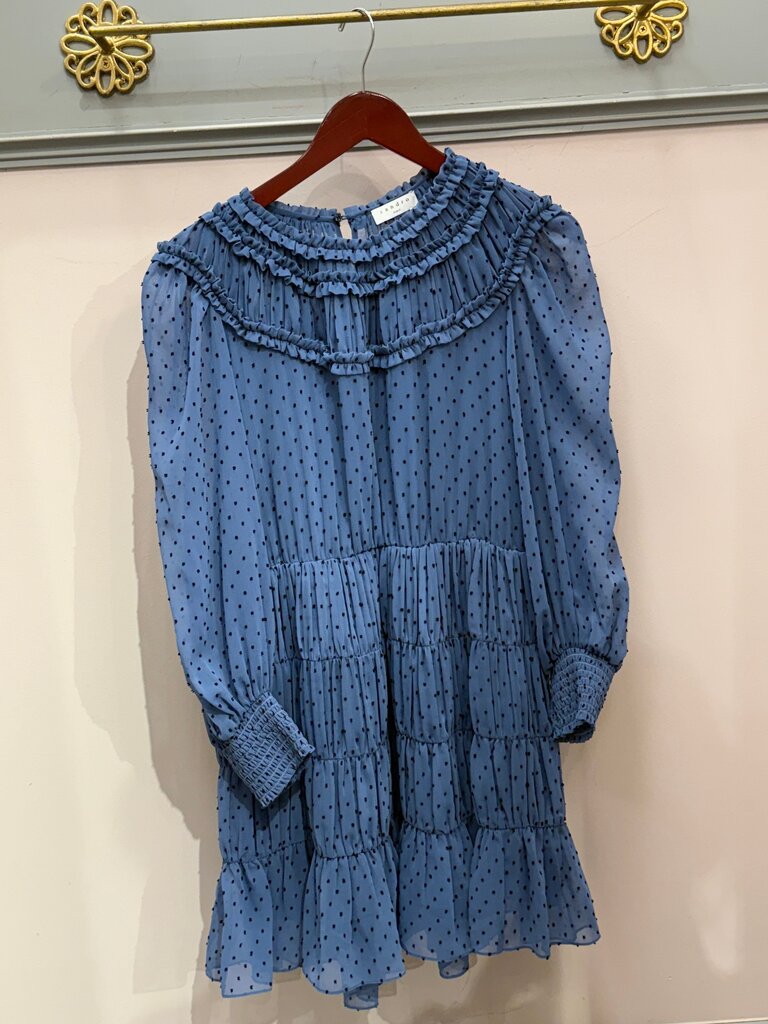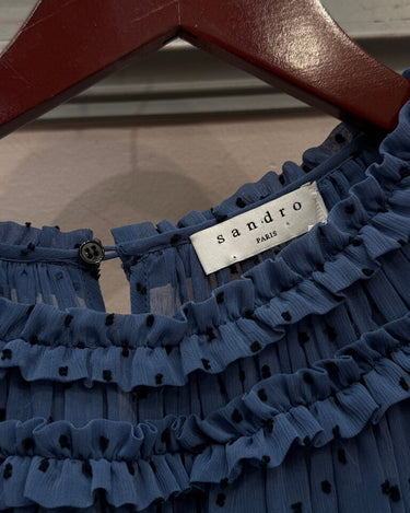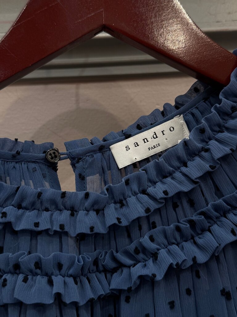 Chic and stylish blue dress by Sandro, featuring ruffled detailing and polka dots, perfect for various occasions.
