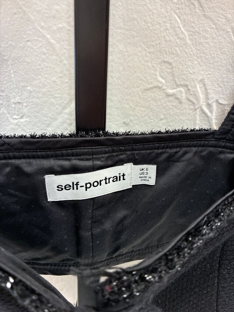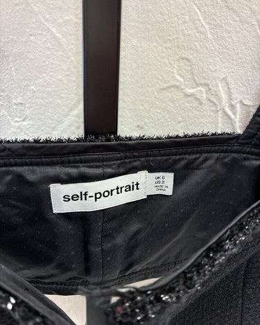 Stylish black cropped top by Self-Portrait featuring intricate detailing and a fitted cut, perfect for layering or wearing alone. Ideal for casual and semi-formal occasions.
