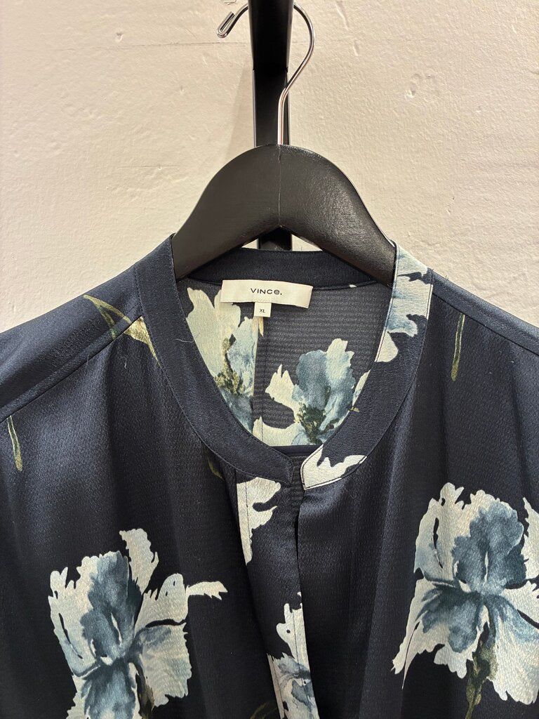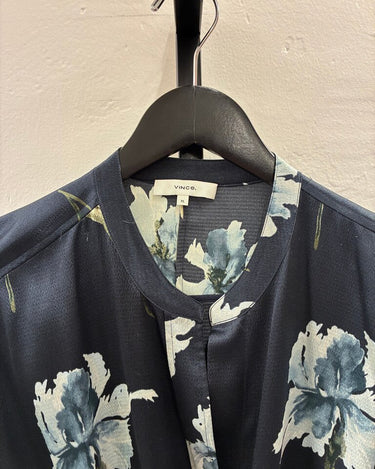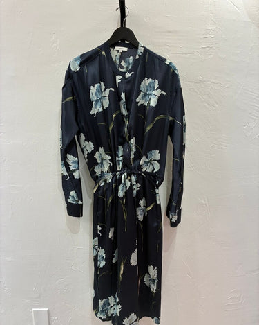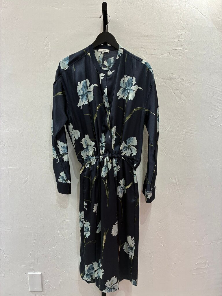 This stylish Vince floral kimono dress features a beautiful navy blue base with delicate floral designs, perfect for various occasions.